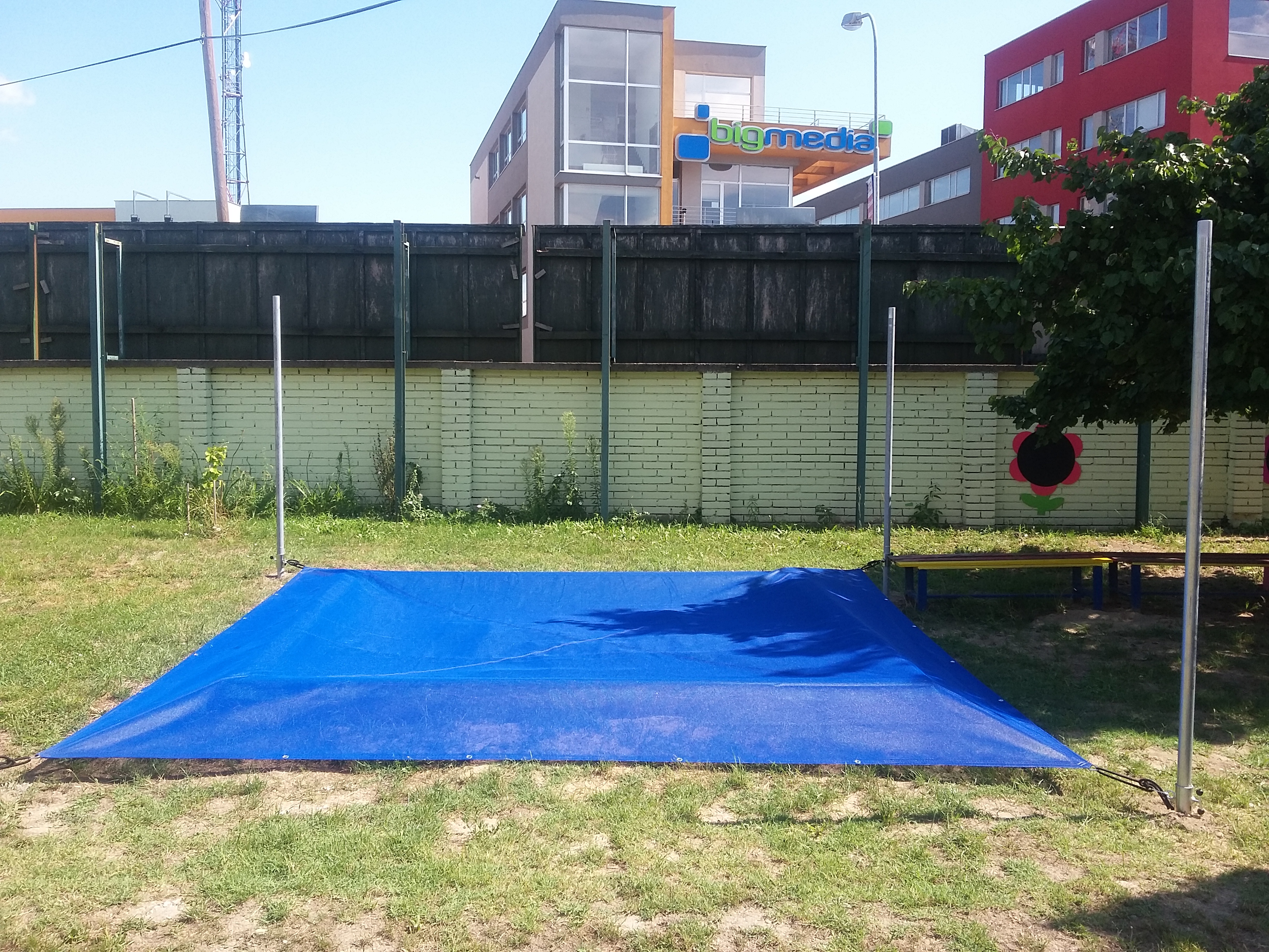 nad pieskovisko v zadnej časti dvora pribudla tieniaca plachta - financované z Vašich príspevkov z 2% daní